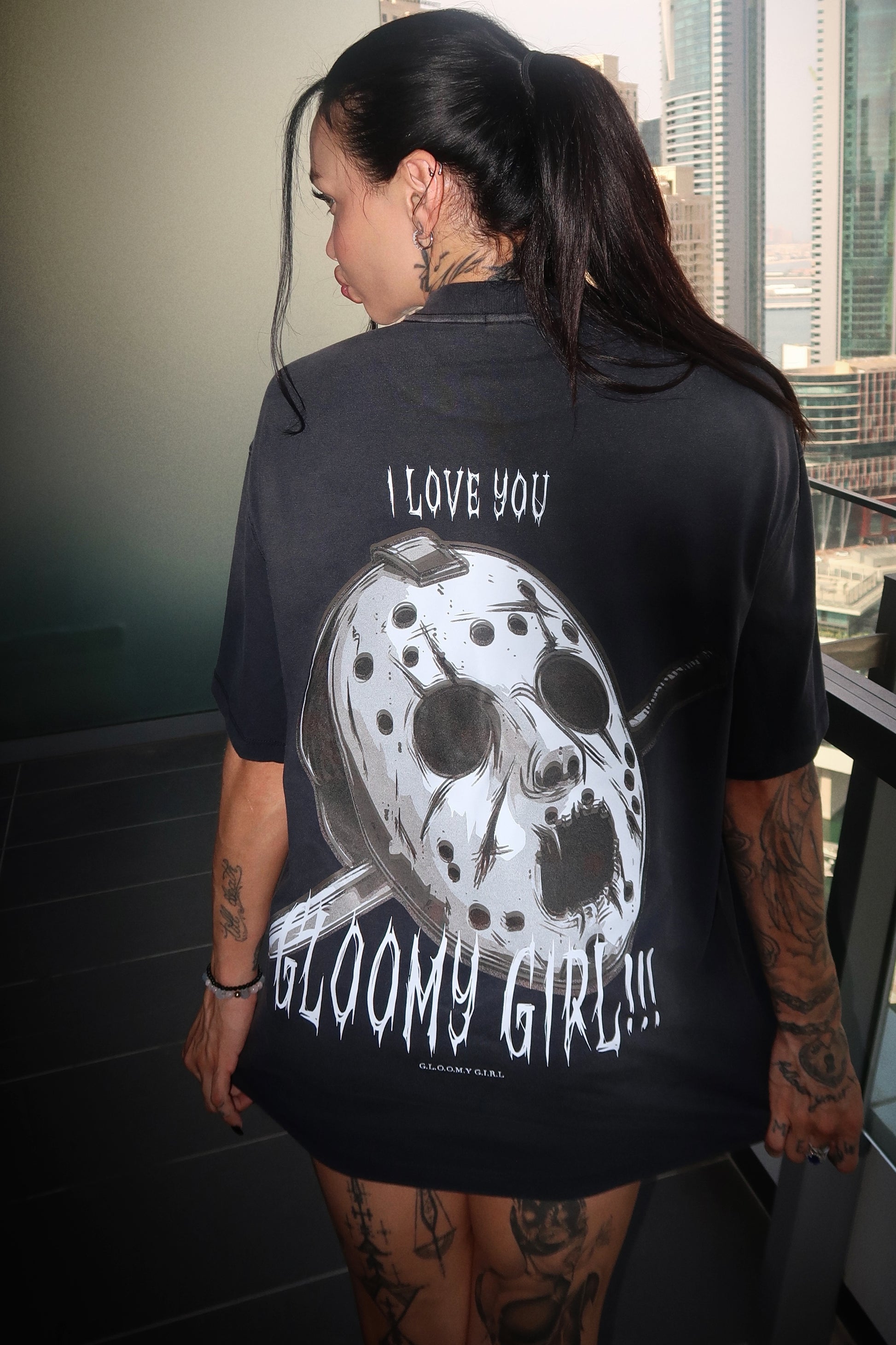 back- 'I love you GLOOMY GIRL!!' with custom JASON mask & dagger.